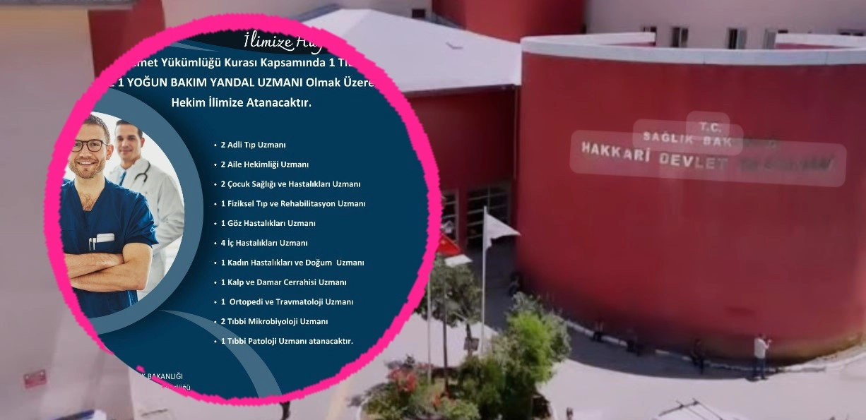 Hakkari iline 117.Devlet yükümlüğü kurası kapsamında 1 Tıbbi Onkoloji Uzmanı ve 1 Yoğun Bakım Yan Dal Uzmanı başta olmak üzere toplam 20 uzman doktor atandı.Sağlık Bakanlığı tarafından yapılan atamalar doğrultusunda Hakkari iline farklı branşlar olmak üzere toplam 20 doktor ataması yapıldı.Hakkari İl Sağlık Müdürlüğü Tarafından yapılan açıklamada, “117. Devlet Hizmet Yükümlüğü Kurası’nda 1 Tıbbi Onkoloji Uzmanı ve 1 Yoğun Bakım Yan dal Uzmanı olmak üzere 20 uzman hekimin Hakkari’ye atanacağı ve bununla beraber, 2 Adli Tıp Uzmanı, 2 Aile Hekimliği Uzmanı, 2 Çocuk Sağlığı ve Hastalıkları Uzmanı 1 Fiziksel Tıp ve Rehabilitasyon Uzmanı, 1 Göz Hastalıkları Uzmanı, 4 İç Hastalıkları Uzmanı, 1 Kadın Hastalıkları ve Doğum Uzmanı, 1 Kalp ve Damar Cerrahisi Uzmanı, 1 Ortopedi ve Travmatoloji Uzmanı, 2 Tıbbi Mikrobiyoloji Uzmanı ve 1 Tıbbi Patoloji Uzmanı atanacak” belirtildi.