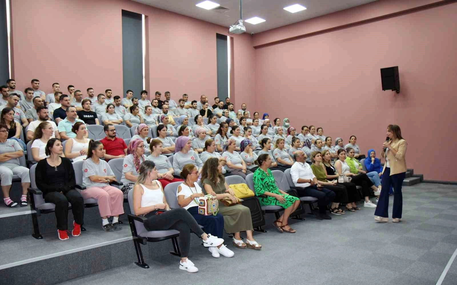 Denizli İl Sağlık Müdürlüğü tarafından bir tekstil firması çalışanlarına, 28 Temmuz Dünya Hepatit Günü etkinlikleri kapsamında bulaşıcı hastalıklardan korunma ve farkındalık eğitimi verildi.Tekstil firmasının yaklaşık 130 çalışana, 28 Temmuz ‘Dünya Hepatit Günü’ kapsamında “Hepatit, Bulaşıcı Hastalıklardan Korunma, Bulaş Yolları, Aşılanmanın Önemi, Aşı Tereddütleri” konularında bilgilendirmeler yapıldı. İl Sağlık Müdürü Uz.Dr. Berna Öztürk ve firma yetkilisi Nuri Turgut’un da katılımıyla firmada çalışanlara, Merkezefendi İlçe Sağlık Müdürü, Halk Sağlığı Uzmanı Dr. Mine Pulat tarafından verilen eğitimde; sağlığın korunması ve bulaşıcı hastalıkların önlenmesinde hijyene dikkat edilmesi, aşıların zamanında yaptırılmasının önemi gibi konulara dikkat çekildi.“Bulaşıcı hastalıkları gelecek nesillere aktarmayalım, aşılarımızı yaptıralım”Denizli İl Sağlık Müdürü Uz. Dr. Berna Öztürk, “Aile Hekimlerimiz, kişinin anne karnına düştüğü andan ölünceye kadarki tüm sağlık verilerini kayıt altına alan, hasta olmadan daha sağlıklı bir yaşam sürmesini sağlayan, kronik hastalıklarını takip ederek yaşam kalitesinin artmasına yol gösteren hekimlerimizdir. Bu nedenle bir rahatsızlığı olmasa bile bireylerin yılda bir kez aile hekimliğine gitmesi, kontrollerini yaptırması çok önemlidir. Bireylerin sağlık hakkının temel bir bileşeni olan aşılama da, koruyucu hekimliğin üstlendiği en önemli görevlerinden biridir. Aşı ile bağışıklamada temel hedef; özellikle çocuklarda, aşı ile önlenebilir hastalıkların ortaya çıkışını engellemek ve bu hastalıkların sebep olduğu sekel ve ölüm oranlarını en aza indirmektir. Rutin aşılama programları sayesinde dünya genelinde aşıyla önlenebilir hastalıklar büyük ölçüde azaltılmıştır. Unutulmamalıdır ki bulaşıcı hastalıkları gelecek nesillere taşımamak için aşıları zamanında yaptırmalıyız. Öncelikle firmalarında çalışanların sağlık konusunda farkındalıklarının artması adına bizleri davet ettikleri için Yönetim Kurulu Başkanı Nuri beye çok teşekkür ediyoruz. Bu davet üzerine bugün Merkezefendi İlçe Sağlık Müdürümüz Uz. Dr. Mine Pulat’ın anlatımlarıyla Hepatiti, bulaşıcı hastalıklar ve aşılar konusunda firma çalışanlarımızı bilgilendirmek istedik. Covid döneminde ve öncesinde Denizli’de birçok firmamıza eğitimler düzenlemiştik. Bu eğitimlerimizi belirli aralıklarla talep eden tüm firmalarımızda sürdüreceğiz” dedi.Firma yetkilisi Nuri Turgut da Denizli İl Sağlık Müdürü Uz. Dr. Berna Öztürk ve ekibine teşekkür ederek böyle bir eğitimin firmada çalışanlarda sağlık konusunda güzel bir farkındalık oluşturacağını ifade etti. Turgut, sağlıklı bireylerin toplumların gelişmesi ve güçlenmesinde rolünün büyük olduğunu belirterek firma olarak her zaman sağlıkla ilgili bu tür etkinlikleri desteklediklerini, bu eğitimlerin devam edeceğini söyledi.