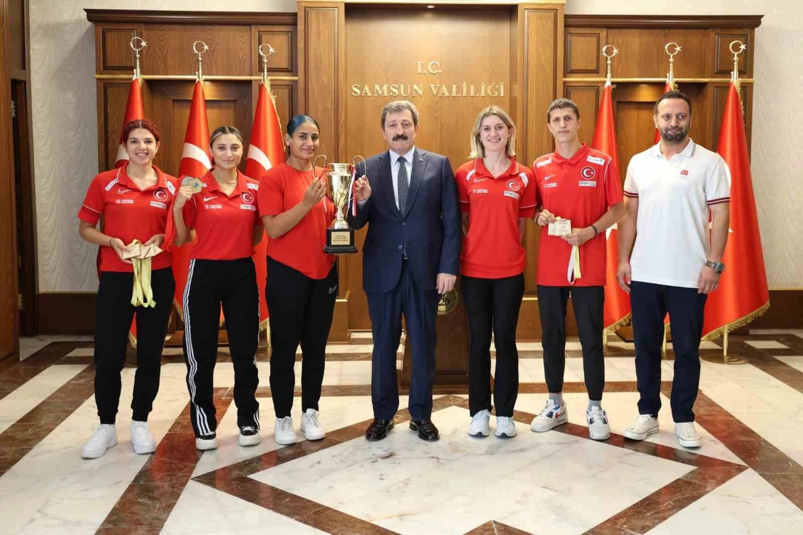 Samsun Valisi Orhan Tavlı, ‘Özel Sporcular Virtus Avrupa Atletizm Şampiyonası’nda şampiyonluk ve rekorlar elde eden Türkiye’nin gururu özel milli sporcuları makamında kabul ederek kutladı.6-11 Haziran 2024 tarihlerinde İsveç’te düzenlenen Özel Sporcular Virtus Avrupa Atletizm Şampiyonası’nda elde ettikleri başarılarla Samsun ve Türkiye’yi gururlandıran özel milli sporculardan Fatma Damla Altın, Esra Bayrak, Eda Yıldırım, Edanur Akın ve Doğukan Bostancı, Gençlik ve Spor İl Müdürü Feyzullah Dereci ve antrenörleri Aytunç Göz ile birlikte, Vali Orhan Tavlı’yı makamında ziyaret etti.Vali Tavlı, “Samsunlu özel milli sporcularımızı tebrik ediyor, 25 Ağustos- 6 Eylül 2024 tarihlerinde ülkemizi temsil edecekleri Paris 2024 Olimpiyat ve Paralimpik Oyunları’nda da başarılarının devamını diliyorum” dedi.Dünya ve Avrupa rekorlarıÖzel Sporcular Virtus Avrupa Atletizm Şampiyonası’nda Fatma Damla Altın 4x100 m bayrak koşusu birinciliği/4x400 m dünya rekoru, Esra Bayrak 4x200 m takım şampiyonluğu, Eda Yıldırım cirit atma birinciliği, çekiç ve gülle atma üçüncülüğü, Edanur Akın 3 bin m su engeli birinciliği/Avrupa rekoru, Doğukan Bostancı 4x200 m bayrak koşusu birinciliği/400 m ikinciliği başarısı gösterdi. Samsunlu özel milli sporcular toplamda 6 altın madalya, 3 gümüş madalya, 1 bronz madalya, 1 dünya rekoru ve 1 Avrupa rekoru elde etti.