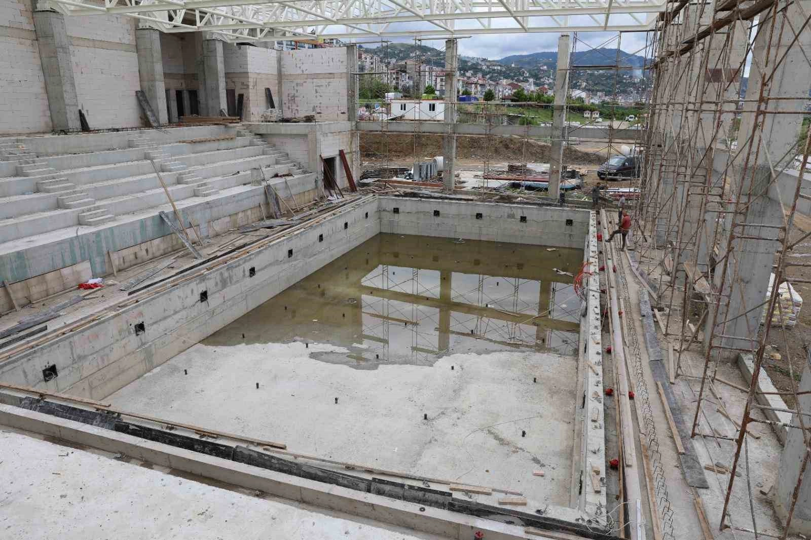 Trabzon’un Akçaabat ilçesinin Yaylacık Mahallesi sahil kısmında yapımı devam eden Yarı Olimpik Kapalı Yüzme Havuzunun kaba inşaatının tamamlanmak üzere olduğu belirtildi.Akçaabat Belediye Başkanı Osman Nuri Ekim, Yarı Olimpik Kapalı Yüzme Havuzunun inşaatında incelemelerde bulunarak yetkililerden bilgi aldı. Belediye Başkanı Osman Nuri Ekim, Yarı Olimpik Kapalı Yüzme Havuzunda yaptığı incelemeler sonucunda havuzun kaba inşaatının tamamlanmak üzere olduğunu ve inşaatta ince imalatların yapımının devam ettiğini belirtti.Yarı Olimpik Kapalı Yüzme Havuzunun uluslararası standartlarda yapıldığını şehirdeki çocuklara, gençlere, üniversite öğrencilere ve tüm Akçaabatlılara kaliteli bir hizmet sunulacağını söyleyen Başkan Ekim, "Yeşille mavinin kucaklaştığı şehrimizde hemşehrilerimizi vizyon projelerle buluşturmaya devam ediyoruz. Şehrimiz için önemli yatırımlardan biri olan Yarı Olimpik Kapalı Yüzme Havuzumuz, Allah’ın izniyle çok yakında hizmet vermeye başlayacak. Yüzme havuzunda kaba inşaat tamamlandı diyebiliriz. İnce imalatların yapımına başlandı. Bu kapsamda inşaat içerisinde sıva yapılıp seramikler döşeniyor. Cam ve çatı çalışmaları yapılıyor. Klima, yağmur ve havalandırma sistemleri şekilleniyor. Havuzumuz açılışını tüm hemşehrilerimle birlikte inşallah çok yakında gerçekleştireceğiz. Akçaabat’ta yediden yetmişe herkesin faydalanabileceği yüzme havuzumuz, bir çok uluslararası organizasyona da ev sahipliği yapabilecek. Şehrimiz, spor ve sağlık turizmi açısından gelişme göstermiş olacak. Ayrıca sahil şehri olan Akçaabat’ımızda yüzme bilmeyen de kalmayacak. Çocuklarımız, gençlerimiz, Şehrimizdeki üniversite öğrencileri, hanım kardeşlerimiz kısacası yediden yetmişe herkes Yarı Olimpik Kapalı Yüzme Havuzumuzdan en yüksek seviyede istifade edebilecek. Şimdiden şehrimize hayırlı uğurlu olsun” dedi.