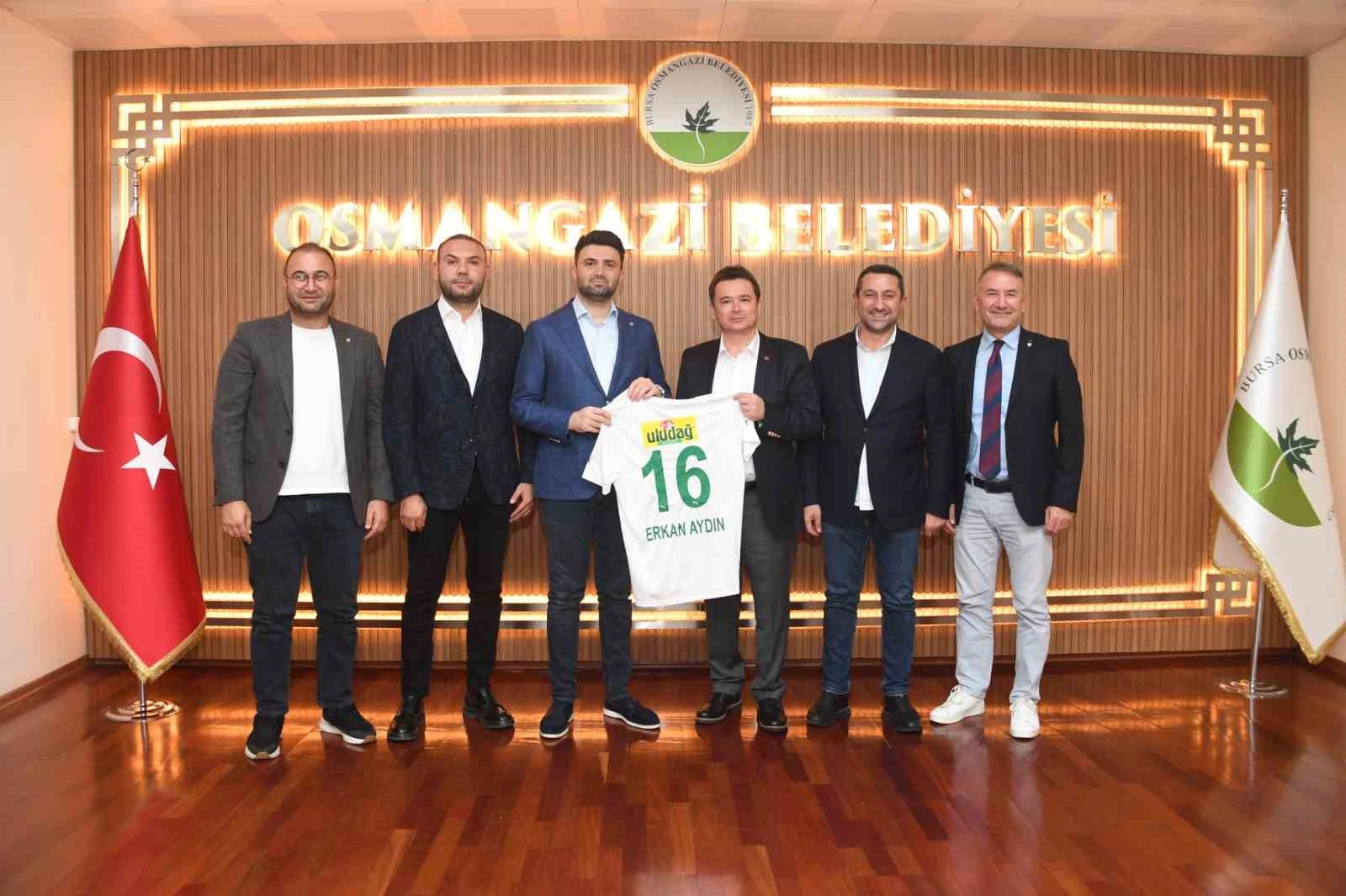 Bursaspor Başkanı Enes Çelik ve Yönetim Kurulu Üyeleri, Osmangazi Belediye Başkanı Erkan Aydın’ı ziyaret etti. Başkan Aydın’a Bursaspor forması hediye eden Enes Çelik, kulübe verdiği desteklerden dolayı teşekkürlerini sundu.Osmangazi Belediye Başkanı Erkan Aydın, Bursaspor Başkanı Enes Çelik ve yönetim kurulu üyeleri Oğuzhan Kutlucan, Coşkun Özgel, Murat Hatipoğlu ve Erdinç Doğan’ı makamında ağırladı. Bursaspor’un bu sezon Enes Çelik başkanlığında çok güzel bir hava yakaladığına dikkat çeken Başkan Aydın, “Enes Başkan, taşın altına elini koyarak son yıllarda zor günler geçiren Bursaspor’un başkanlığı için aday oldu. Başkan seçilmesiyle birlikte de mali ve idari açıdan çok önemli işler yaptı. Transfer tahtasını açarak, kulübe birbirinden önemli oyuncuların katılmasını sağladı. Tüm şehir, Bursaspor için bir kez daha kenetlendi. Sezonun başlamasıyla birlikte, yıllardır hasret kaldığımız galibiyet sevinçlerini yeniden yaşadık. Enes Başkan ve yönetim kurulu üyelerinin Bursaspor’u yeniden eski ihtişamlı günlerine kavuşturacağına olan inancımız tam. Yolun sonu Süper Lig olacaktır. Bizler her konuda Bursaspor’un ve yönetiminin destekçisiyiz” dedi.Ziyaretin sonunda Bursaspor Başkanı Enes Çelik de desteklerinden dolayı Başkan Aydın’a teşekkür ederek, isminin yazılı olduğu yeşil beyazlı formayı hediye etti.