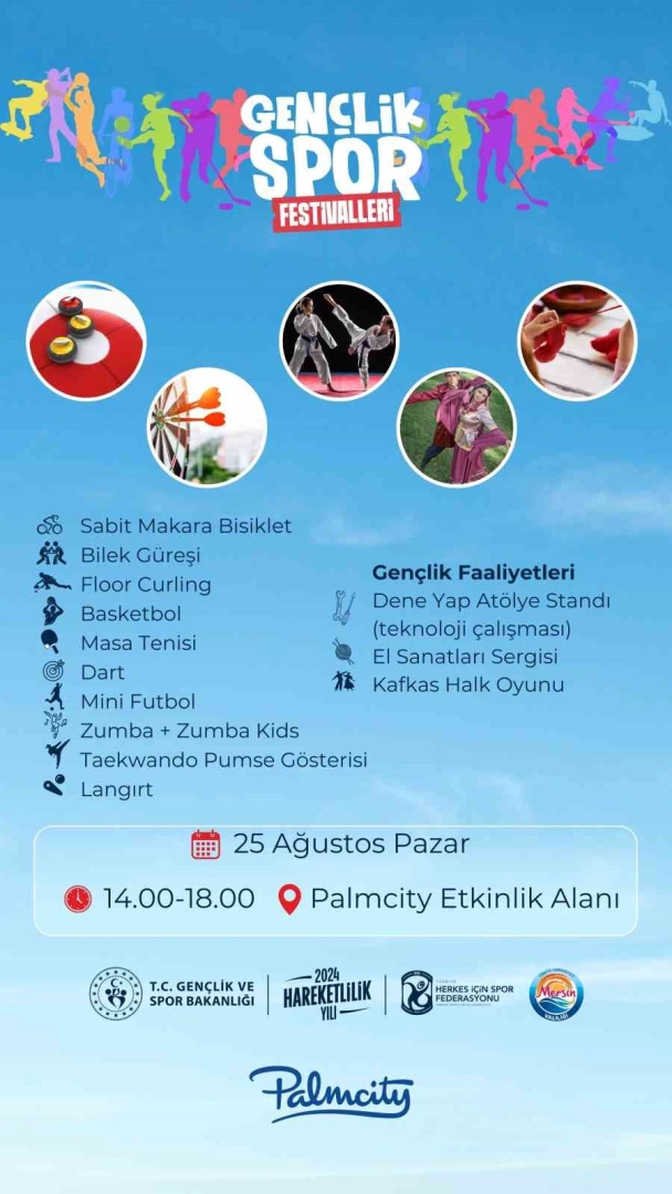 Mersin’de, Gençlik ve Spor İl Müdürlüğü ile Herkes İçin Spor (HİS) Federasyonu İl Temsilciliği tarafından Gençlik ve Spor Festivali düzenlenecek.2024 Hareketlilik Yılı kapsamında tüm bireylerin harekette kalmaları, sporla iç içe bir yaşam sürmeleri, sağlıklı ve kaliteli yaşam için sportif hareketliliğe katılmalarının önemine dikkat çekmek amacıyla etkinlikler düzenleniyor. Mersin’de düzenlenecek festivalde yarın saat 14.00-18.00 arasında bir alışveriş merkezinin etkinlik alanında; sabit makara bisiklet, bilek güreşi, floor curling, basketbol, masa tenisi, dart, mini futbol, taekwondo pumse gösterisi, zumba ve zumba kids gösterilerinin yanı sıra gençlik etkinlikleri çerçevesinde ise Kafkas halkoyunları gösterisi gerçekleştirilecek.Ayrıca Deneyap Teknoloji Atölyesi Standı’nda teknoloji çalışması ve el sanatları sergisi de düzenlenecek.
