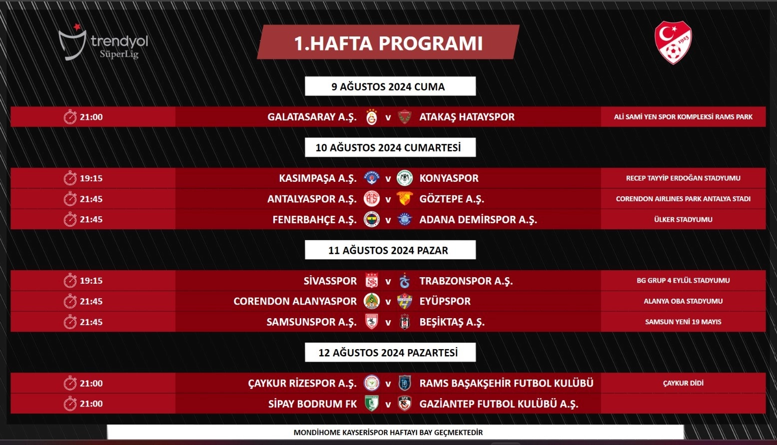Türkiye Futbol Federasyonu (TFF), Trendyol Süper Lig’de 1. ve 2. haftanın müsabaka programını açıkladı.Trendyol Süper Lig’de 1. ve 2. haftanın müsabaka programı açıklandı. 2024 - 2025 sezonu, son yıllarda olduğu gibi son şampiyon takımın oynayacağı müsabaka ile açılacak. Buna göre Galatasaray ile Hatayspor arasındaki mücadele 9 Ağustos Cuma günü saat 21.00’de oynanacak.Ayrıca 5 Ağustos’ta yapılacak olan play-off turu kura çekimleri sonrasında kulüplerin UEFA Kupaları fikstürlerine göre 3 ve 4. hafta programları, 29 - 30 Ağustos tarihlerinde gerçekleştirilecek lig aşaması fikstür çekimleri sonrasında yapılacak çalışma ile ilk yarının kalan haftalarının programının ilan edileceği belirtildi.Trendyol Süper Lig’de 1. ve 2. haftanın programı şöyle:1. hafta9 Ağustos Cuma21.00 Galatasaray - Hatayspor10 Ağustos Cumartesi19.15 Kasımpaşa - Konyaspor21.45 Antalyaspor - Göztepe21.45 Fenerbahçe - Adana Demirspor11 Ağustos Pazar19.15 Sivasspor - Trabzonspor21.45 Corendon Alanyaspor - Eyüpspor21.45 Samsunspor - Beşiktaş12 Ağustos Pazartesi21.00 Çaykur Rizespor - RAMS Başakşehir21.00 Bodrum FK - Gaziantep FK2. hafta16 Ağustos Cuma21.00 Konyaspor - Galatasaray17 Ağustos Cumartesi19.15 Kayserispor - Sivasspor21.45 Adana Demirspor - Çaykur Rizespor21.45 Göztepe - Fenerbahçe18 Ağustos Pazar19.15 RAMS Başakşehir - Corendon Alanyaspor21.45 Gaziantep FK - Samsunspor21.45 Beşiktaş - Antalyaspor19 Ağustos Pazartesi21.00 Hatayspor - Kasımpaşa21.00 Eyüpspor - Bodrum FK