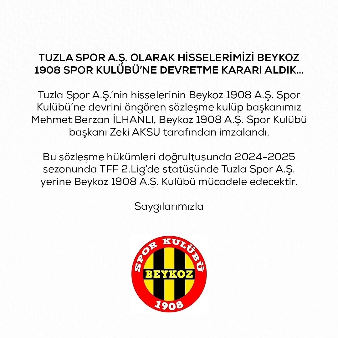 Tuzlaspor, TFF 2. Lig yarışma haklarının İstanbul Süper Amatör Ligi takımlarından Beykoz 1908 SK’ya devredildiğini açıkladı. Bu anlaşmanın ardından Beykoz 1908 SK, 2024-2025 sezonunda TFF 2. Lig’de mücadele edecek.TFF 2. Lig takımlarından Tuzlaspor, hisselerinin İstanbul Süper Amatör Ligi ekiplerinden Beykoz 1908 SK’ya devredildiğini duyurdu. Konuyla ilgili Tuzlaspor’un resmi sosyal medya hesabından yapılan açıklamada, "Tuzlaspor A.Ş. olarak hisselerimizi Beykoz 1908 Spor Kulübü’ne devretme kararı aldık. Tuzla Spor A.Ş.’nin hisselerinin Beykoz 1908 A.Ş. Spor Kulübü’ne devrini öngören sözleşme kulüp başkanımız Mehmet Berzan İlhanlı ve Beykoz 1908 A.Ş. Spor Kulübü Başkanı Zeki Aksu tarafından imzalandı. Bu sözleşme hükümleri doğrultusunda 2024-2025 sezonunda TFF 2. Lig’de Tuzlaspor A.Ş. yerine Beykoz 1908 A.Ş. Kulübü mücadele edecektir" denildi.Geçtiğimiz sezon Trendyol 1. Lig’de mücadele eden Tuzlaspor, topladığı 38 puanla 16. sırada yer alarak küme düşmüştü.