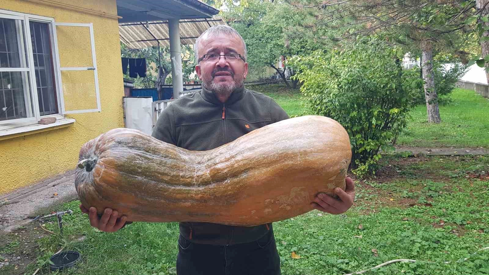 Karabük’te bir bahçede yetişen kabak 40 kilogramlık ağırlığı, 110 santimetrelik boyuyla dikkat çekiyor.Melisa köyünde yaşayan Fahri Akbıyık bahçesine kabak yetiştirmek için tohum ekti. Hasat vaktine yakın zamanda bahçesini gezen Akbıyık, boyu 70 santimetreyi bulan kabağı görünce büyük şaşkınlık yaşadı.Melise köyünde küçük çaplı tarımla uğraştığını belirten Fahri Akbıyık, kabağı ilk başta kızartmalık olarak zannettiğini söyledi. İki hafta önce bahçeye gittiğinde kabağın çok büyüdüğünü ifade eden Akbıyık, bu zamana kadar böyle bir kabak görmediğini ve çok şaşırdığını kaydetti. Akbıyık, "İki gün önce almaya gittik, tarttık. 40 kilo 650 gram olduğunu gördük. Hayvan gübresiyle toprağı karıştırıp tohumlamıştık. Sulamıştık. Onun haricinde ilaçlama yapmadık" diye konuştu.İlk defa böyle bir şey ile karşılaştığını anlatan Akbıyık, görenlerinde şaşkınlık yaşadığını aktardı.