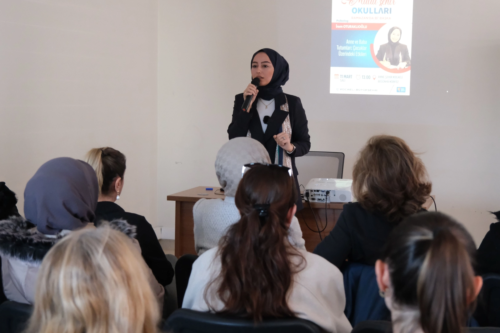 Kocaeli Büyükşehir Belediyesi’nin "Mutlu Şehir Okulları Ramazan’da Bi’ Başka" etkinlikleri hız kesmiyor. Mutlu Ebeveynler Okulu başlığı altında söyleşi gerçekleştiren Psikolog İrem Oturaklıoğlu, "Anne ve Baba Tutumları: Çocuklar Üzerindeki Etkileri" konusunu ele aldı. Anne Şehir Merkezi Begonya’da düzenlenen söyleşide katılımcılarla buluşan Oturaklıoğlu, ebeveynlerin çocuklarıyla iletişime geçtikçe kendi ebeveynlik tarzlarını daha iyi fark ettiklerini belirterek, "Bir anne çocuğuyla ne kadar iletişim kurarsa, kendi annelik tutumlarını o kadar iyi görebilir. Bu farkındalık, çocukla sağlıklı ilişki kurmanın temelidir" dedi.