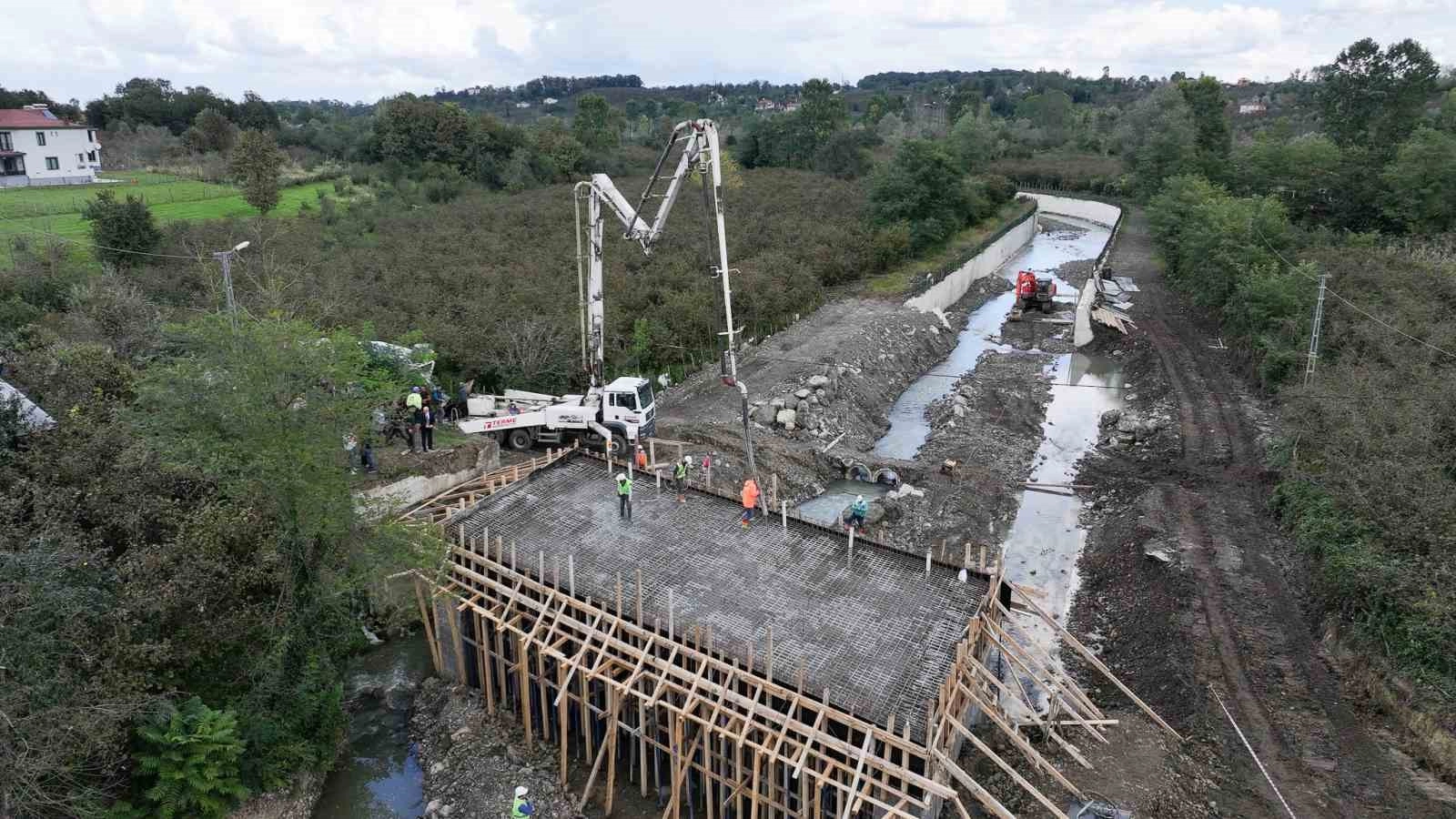 SAMSUN (İHA) – Samsun’un Terme ilçesinde sel felaketinin ardından yıkılan Bazlamaç Mahallesi Karagöl mevkisindeki köprünün yapımında sona yaklaşılıyor.Terme’de yaşanan sel felaketinin ardından yıkılan Bazlamaç Mahallesi Karagöl mevkiindeki köprünün yapımına DSİ tarafından yeniden başlandı. İnşa sürecinin sonuna yaklaşırken köprü çalışmasında incelemede bulunan Terme Belediye Başkanı Şenol Kul, çalışmalar hakkında bilgi aldı.Bazlamaç Mahallesi Karagöl mevkisinde yapımına devam edilen köprünün Bazlamaç Mahallesi’nin çevre mahallelerle bağlantısı açısından önemine vurgu yapan Başkan Şenol Kul, “Küresel iklim değişikliğinin etkisiyle ani ve şiddetli gelen yağışlar ilçemizde son dönemlerde çok sayıda sel felaketi yaşanmasına neden oldu. Bu noktada ilçemizin bu gibi durumlara daha dayanaklı hale gelmesi için sel riskinin önüne geçebileceğimiz önemli projeleri hızla hayata geçiriyoruz. Daha önce yine sel felaketinde yıkılan bu köprümüz gayet sağlam ve su akışını engellemeyecek şekilde DSİ tarafından yeniden yapılıyor. Bazlamaç Mahallemizin diğer mahallelerimizle bağlantısı olan bu köprü inşası tamamlandığında ulaşımda meydana gelen rahatlama ile birlikte mahalle halkımız da konforu artacak” dedi.Başkan Kul, açıklamasının devamında ise şunları söyledi:“DSİ tarafından ilçemizin birçok noktasında önemli çalışmalar yürütülüyor. Bu çalışmalar için başta DSİ 7. Bölge Müdürümüz Köksal Buğra Çelik ve tüm DSİ çalışanlarına teşekkür ederim. Ayrıca bölgedeki çalışmaların hızlanması konusunda Meclis’ten ek bütçe çıkartarak büyük destek sağlayan TBMM Plan ve Bütçe Komisyonu Başkanı Samsun Milletvekilimiz Mehmet Muş’a da şükranlarımı sunarım.”