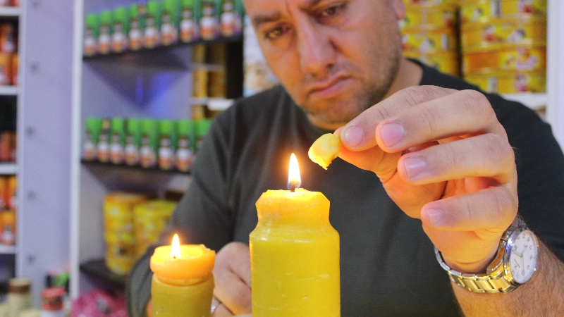 Kilogram fiyatının 2 bin lira olduğunu belirten bal üreticisi Cemal Tomris, "Biliyorsunuz bal iki nektar ve bal mumundan oluşur. Bu iki üründen biri yani nektar doğadan gelirken bal mumu ise arının vücudundan salgıladığı bir sıvıdır. Bal mumunun en eşsiz ve büyülü özelliklerinden biri havayı temizleme yeteneğidir. Bal mumu yandığı zaman havaya negatif iyonlar yayar ve bu negatif iyonlar havadaki yani odanızdaki kirleticileri mikropları ve kokuları giderir. Temiz bir hava oluşturur. Bal mumunun özellikle astım hastaları ve yatalak hastası olan insanlara da iyi geldiği biliniyor. Bunun haricinde bal mumunun bir ışık kaynağı olduğunu biliyoruz. Bu ışığı seyretmek gözü dinlendirdiği gibi beyni de dinlendirir. İç bir ferahlık ve huzur sağlar. Haricinde kalp ve karaciğer olarak pekiştirici bir faydası vardır. 7 kilogram bir bal mumu üretmek için arının 180 kilo bal tüketmesi lazım. Küçük yanıklarda kullanmıştır ve enfeksiyon önleyici bir özelliği vardır. Bunun haricinde öğrenciler, müderrisler, padişahlar ve asilzadeler bunu kendi evlerinde sağlıklı olduğu için kullanmışlardır. Kozmetik ürünlerde ve cilt bakım ürünlerde kullanılmıştır. Özellikle bal mumunda A vitamininin olması sebebiyle hücre yenileme özelliği vardır. Bunu keşfeden insanoğlu bal mumu banyosu yapmıştır ve banyosu insan sağlığı için birebir olmuştur. Çünkü hem cildi nemlendirir hem cildi yumuşatır hem de kas ve eklem ağrılarına iyi geldiği insanlar tarafından görülmüştür’’ dedi.