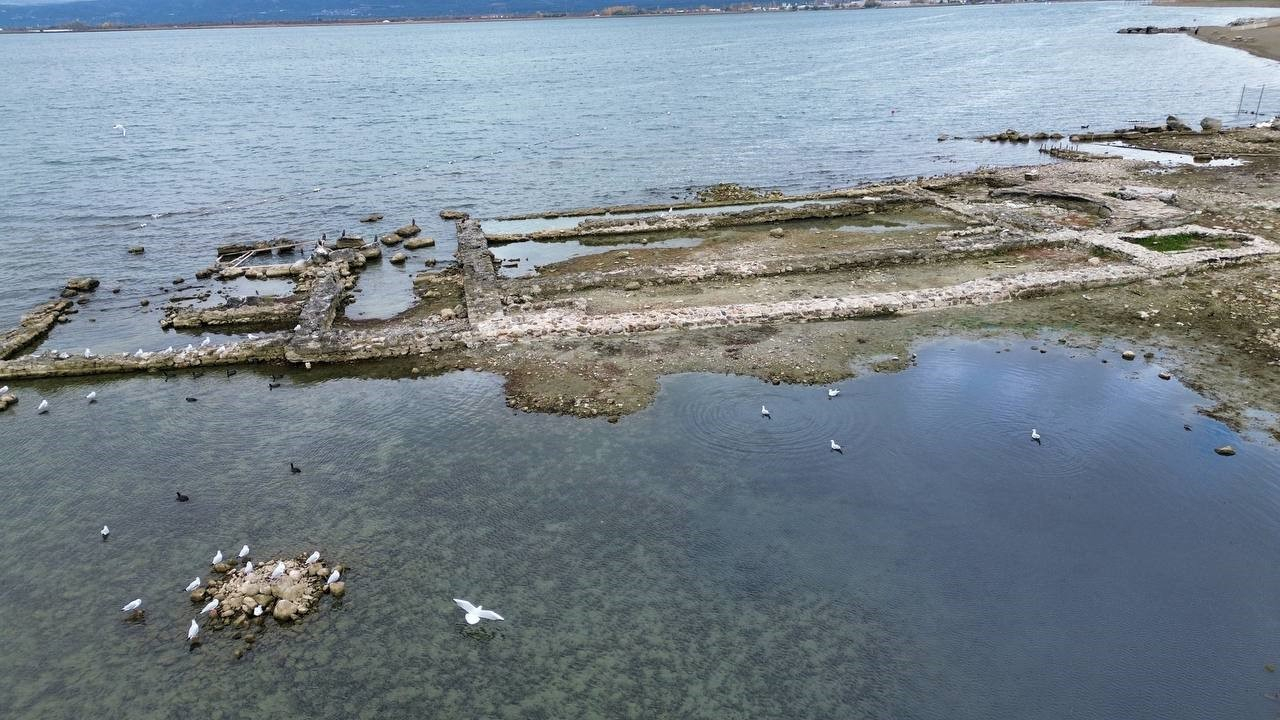 İznik Gölü'nde yaşanan su çekilmesi nedeniyle, 2014'te keşfedilen batık bazilika kalıntısının artık tamamen görünür hale geldi.