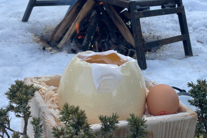 Bursa'da doğada yemek yapan 53 yaşındaki Süleyman Ateştepe, yaklaşık 1500 kilometre uzaklıktaki Ağrı Dağı eteklerinden getirttiği deve kuşu yumurtasını Uludağ'da karlar üzerinde yaktığı ateşte tavada pişirdi.