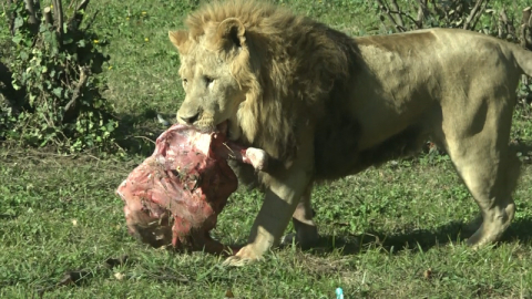 Bursa Hayvanat Bahçesi'ndeki hayvanların hareketlenmesi için farklı yöntemlerle yapılan besleme egzersizleri nefesleri kesti. Bulundukları barınaklarından çıkan aslanlar, karkas olarak bırakılan yaklaşık 50 kiloluk eti kısa sürede parçaladı.