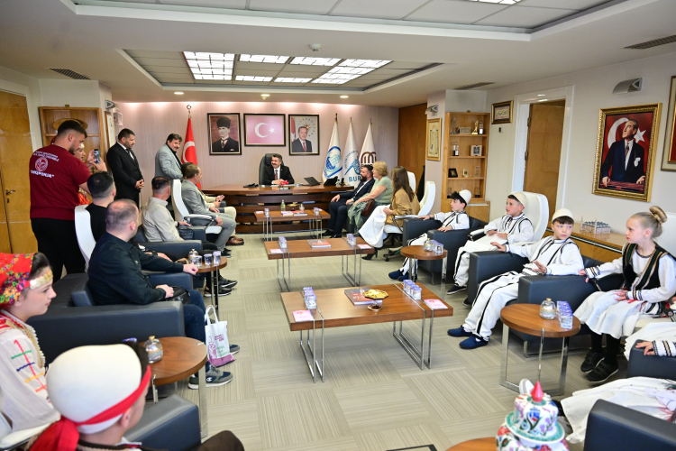 23 Nisan Ulusal Egemenlik ve Çocuk Bayramı kutlamaları için Bursa’ya gelen Kuzey Makedonya ve Kosova halk dansları topluluğu üyesi çocuklar, Yıldırım Belediye Başkanı Oktay Yılmaz’ı makamında ziyaret etti.