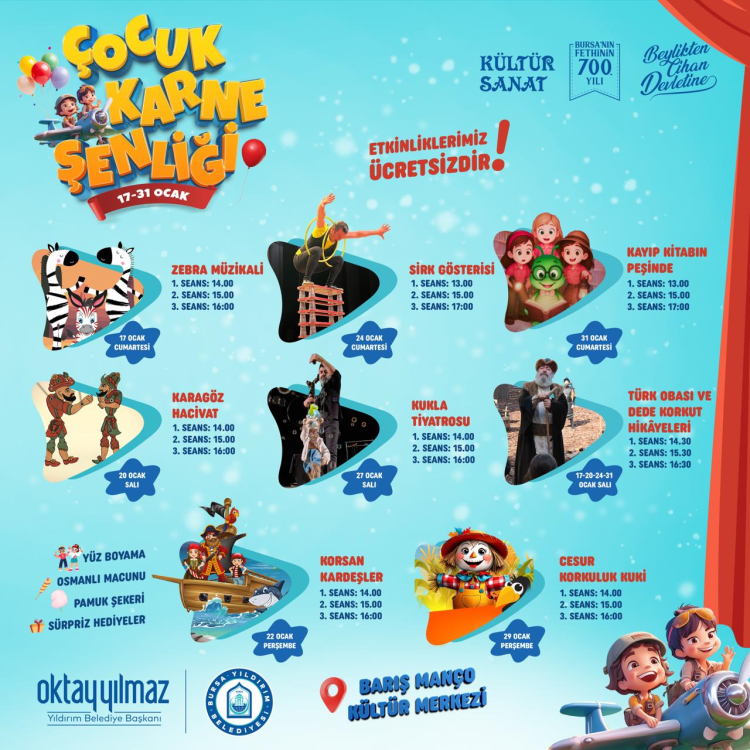 Yıldırım Belediyesi Kültür Sanat ve Sosyal İşler Müdürülüğü, çocukların dolu dolu bir tatil geçirmeleri için 17-31 Ocak tarihleri arasında Karne Şenliği düzenliyor. Barış Manço Kültür Merkezi’nde düzenlenen şenliklerde birbirinden eğlenceli etkinlikler ücretsiz şekilde çocuklarla buluşacak.