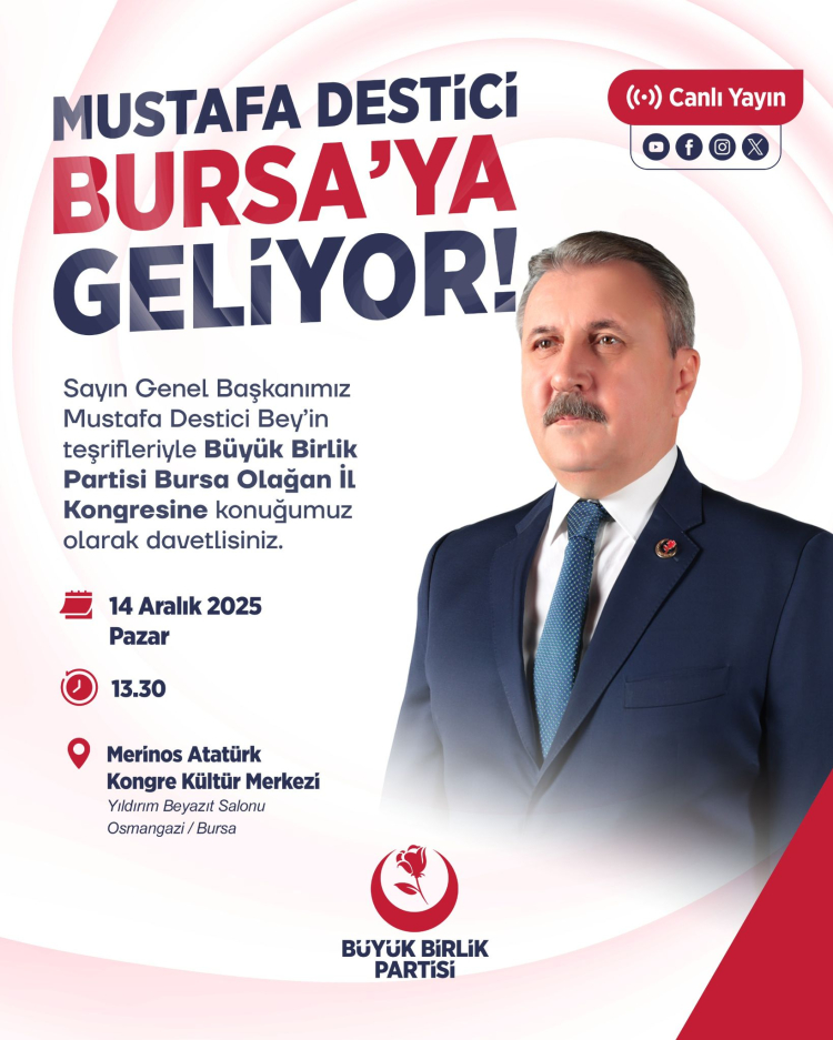 Büyük Birlik Partisi (BBP) Bursa İl Başkanlığı, il kongresinin 14 Aralık 2025 Pazar günü saat 13.30’da Merinos Atatürk Kongre ve Kültür Merkezi’nde gerçekleştirileceğini duyurdu. Kongreye BBP Genel Başkanı Mustafa Destici’nin de katılacağı açıklandı.