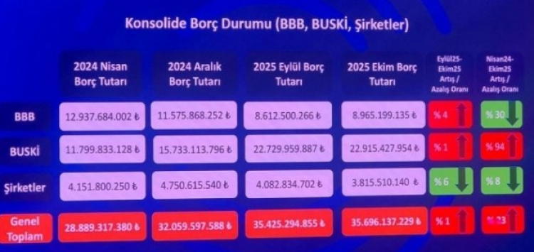 Başkan Bozbey, Eylül ile Ekim ayları arasındaki değişimlere de değinerek, Büyükşehir Belediyesi’nin borcunda yüzde 4’lük artış, BUSKİ’de yüzde 1’lik artış, şirketlerde ise yüzde 6’lık düşüş olduğunu açıkladı. Nisan 2024’ten itibaren ise Büyükşehir’in toplam borcunun 835 milyon Euro’dan 735 milyon Euro’ya gerilediğini belirtti.