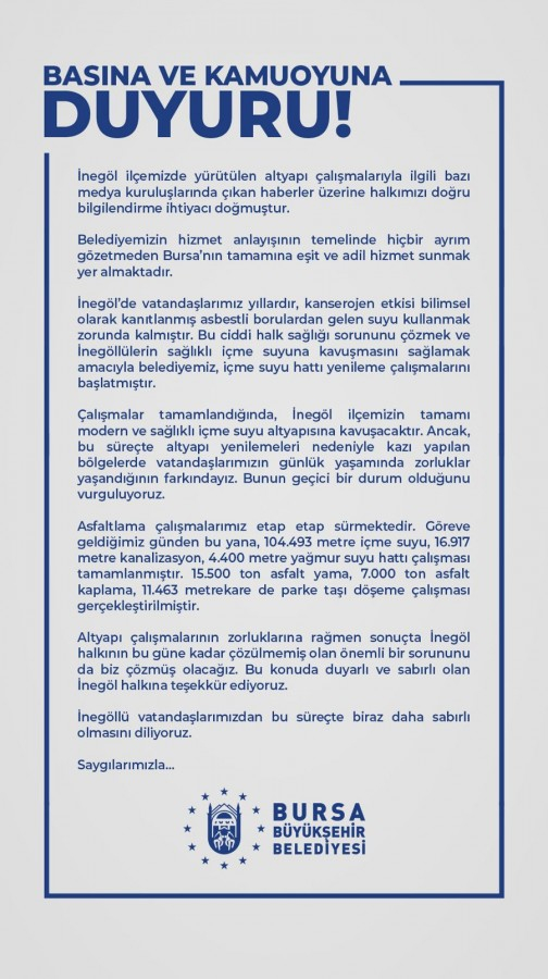 Bursa'nın İnegöl ilçesinde yürütülen altyapı çalışmalarıyla ilgili bazı medya kuruluşlarında çıkan haberler üzerine Bursa Büyükşehir Belediyesi açıklama yaptı.