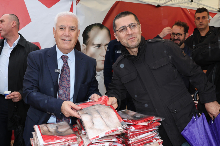 Marmara Belediyeler Birliği (MBB) ve Bursa Büyükşehir Belediye Başkanı Mustafa Bozbey de bu kapsamda Kent Meydanı’nda vatandaşlara Ata posteri dağıttı.