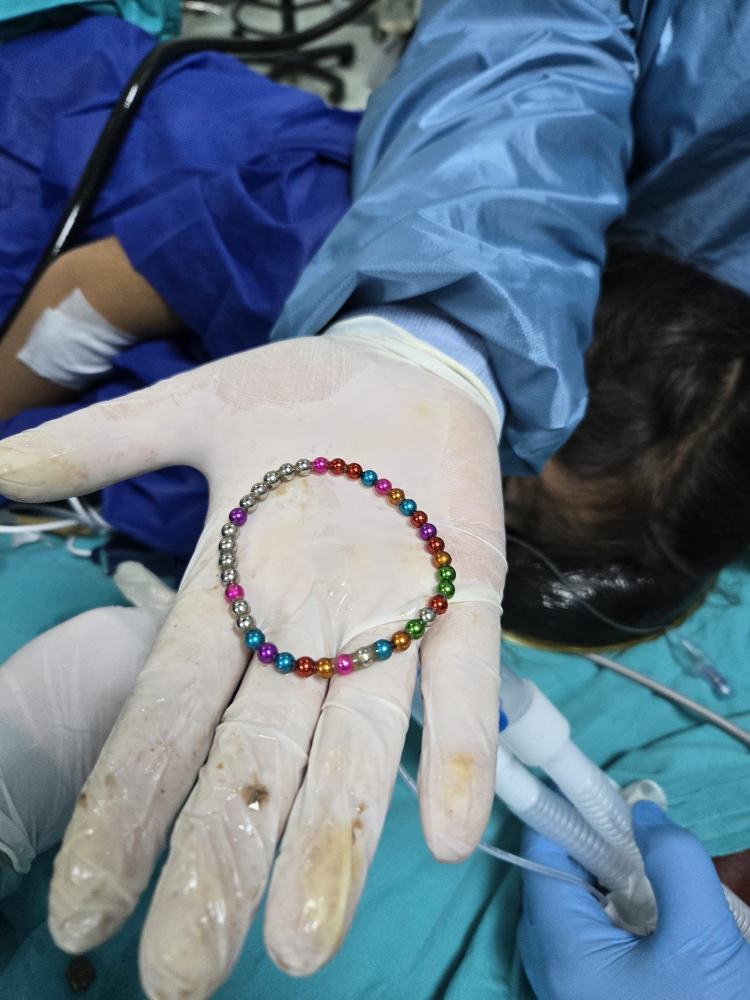 Bursa Yüksek İhtisas Eğitim ve Araştırma Hastanesi'nde, mıknatıslı boncuk bileklik yutan 5 yaşındaki kız çocuğunun bağırsağından 38 adet mıknatıs çıkartıldı.