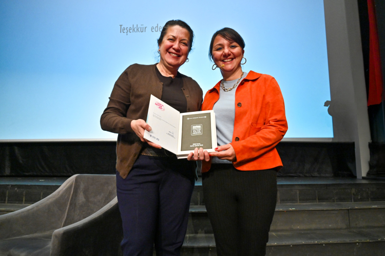 Programın sonunda Kültür, Sanat ve Sosyal İşler Dairesi Başkanı Şafak Baba Pala tarafından Yazar Burcu Ural Kopan’a günün anısına hediye verildi.