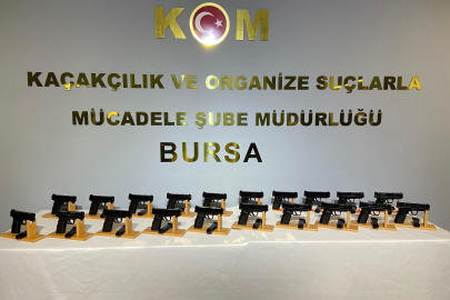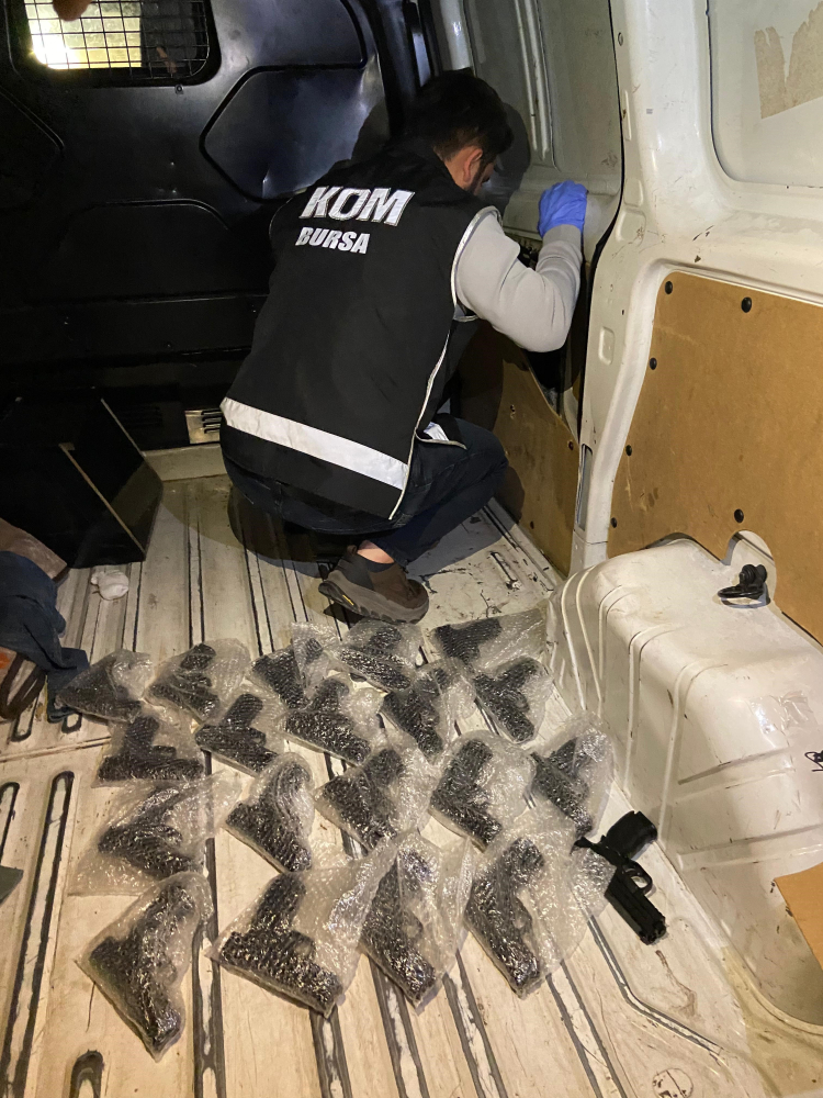 Bursa İl Emniyet Müdürlüğü Kaçakçılık ve Organize Suçlarla Mücadele Şube Müdürlüğü Organize Suçlar Büro Amirliği'nce ruhsatsız silah imal ve ticaretini önlemek üzere yapılan çalışmalarda il dışından Bursa'ya kaçak silah ticareti yapılacağı bilgisi alındı. Durum üzerine harekete geçen ekipler, şüpheli otomobili takibe aldı. Bursa sınırları içine giren şüpheli araç, Kaçakçılık ve Organize Suçlarla Mücadele Şube Müdürlüğü Organize Suçlar Büro Amirliği ekiplerinin film sahnelerini aratmayan operasyonuyla durduruldu. Şüpheli E.A., ekiplerce gözaltına alındı. Araç içerisinde yapılan aramada 20 adet ruhsatsız tabanca ele geçirildi. E.A. ise ifadesi alınmak üzere emniyete götürüldü. Emniyetteki ifadesinin ardından mahkemeye sevk edilen E.A., çıkarıldığı mahkemece tutuklanarak cezaevine gönderildi.