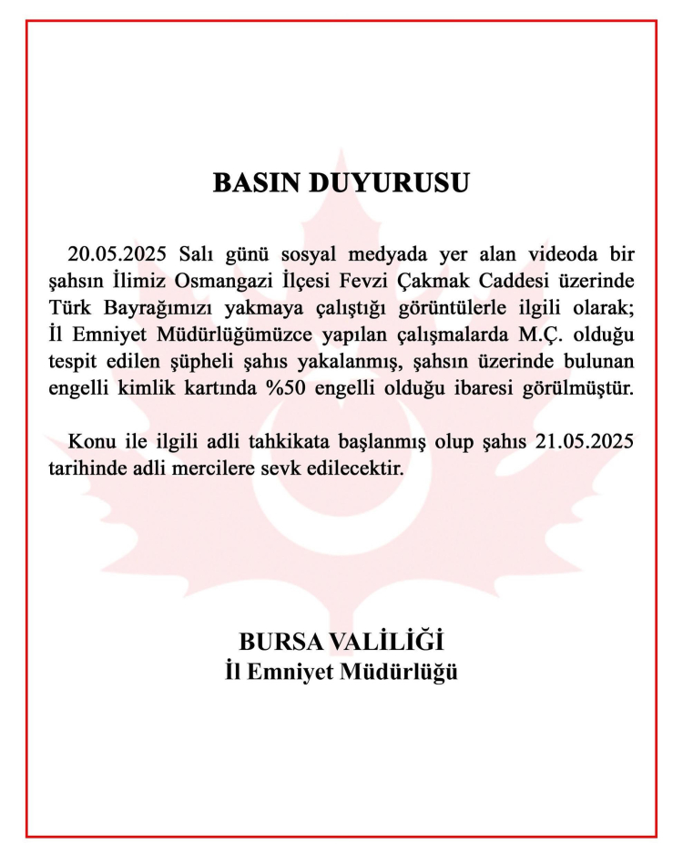 Olay sonra Bursa Valiliği yaptığı açıklamada, "20.05.2025 Salı günü sosyal medyada yer alan videoda bir şahsın ilimiz Osmangazi ilçesi Fevzi Çakmak Caddesi üzerinde Türk bayrağımızı yakmaya çalıştığı görüntülerle ilgili olarak; İl Emniyet Müdürlüğümüzce yapılan çalışmalarda M.Ç. olduğu tespit edilen şüpheli şahıs yakalanmış, şahsın üzerinde bulunan engelli kimlik kartında yüzde 50 engelli olduğu ibaresi görülmüştür. Konu ile ilgili adli tahkikata başlanmış olup, şahıs 21.05.2025 tarihinde adli mercilere sevk edilecektir" ifadelerine yer verdi.