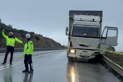Bursa’nın İznik ilçesinde kontrolden çıkan kamyon bariyerlere çarparken, uçuruma düştüğünü zanneden sürücü ise araçtan atlayarak hafif şekilde yaralandı. Sürücüsüz ilerleyen kamyon ise bariyerlere çarparak 400 metre ilerde durdu.