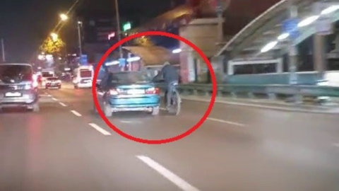 Bursa'da seyir halindeki otomobile tutunarak ilerleyen bisiklet sürücüsü kendisini tehlikeye attı. O anlar saniye saniye kaydedildi.