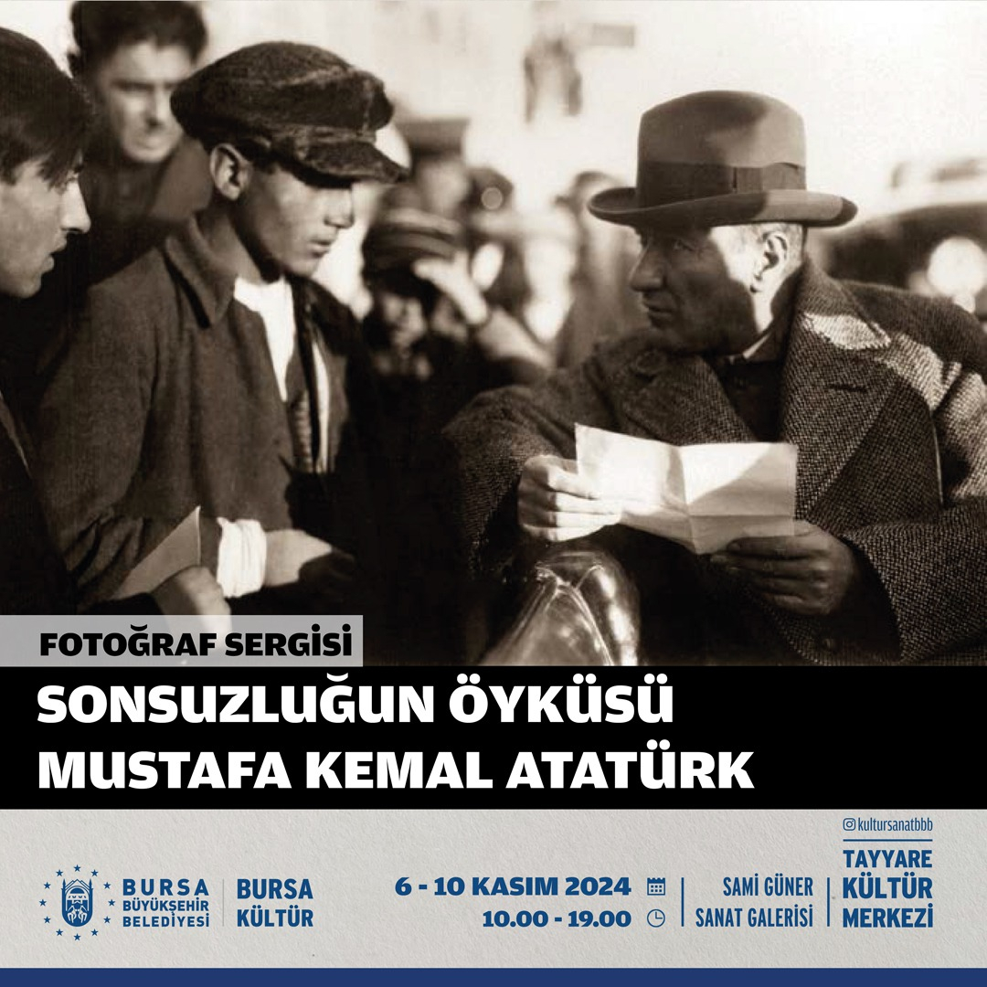 Bursa Büyükşehir Belediyesi, Ulu Önder Mustafa Kemal Atatürk’ün vefatının 86’ncı yıl dönümünde 10 Kasım Atatürk'ü Anma Haftası kapsamında birbirinden zengin içerikli programlar düzenliyor. Programlar kapsamında hazırlanan ‘Sonsuzluğun Öyküsü-Mustafa Kemal Atatürk’ fotoğraf sergisi, 6-10 Kasım tarihleri 10.00-19.00 saatleri arasında Tayyare Kültür Merkezi Sami Güner Sanat Galerisi'nde ziyaret edilebilecek.