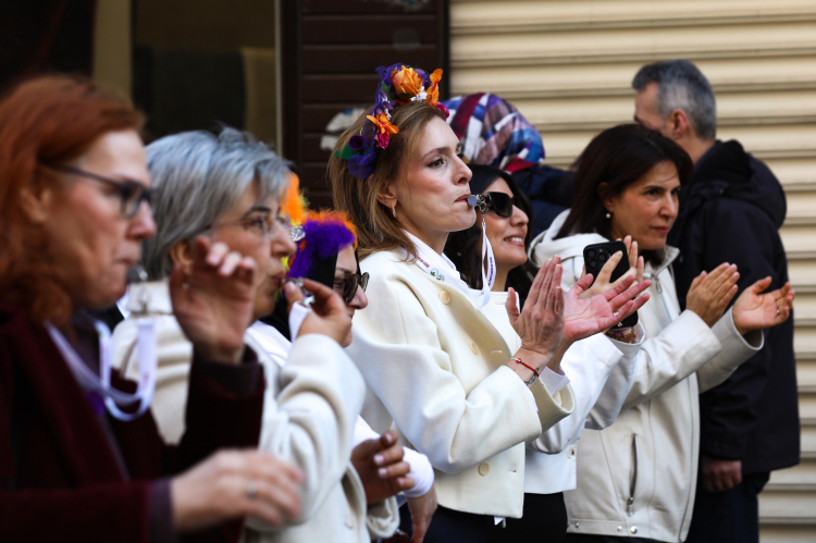 Cumhuriyet Caddesi’nden Hanlar Bölgesi’ne kadar yürüyen Bursalı kadınlar, 8 Mart Dünya Kadınlar Günü etkinlikleri kapsamında ‘Saklandığımız değil, Buluştuğumuz yerdeyiz. Biz birbirimizin çaresiyiz’ mesajını verdi. Ellerinde ‘İstismarı aklama! Asla yalnız yürümeyeceksin!’ yazılı döviz, afiş ve pankartlar taşıyan kadınlar, ‘Yaşasın kadın dayanışması’ sloganları atarak görünmez kılınmalarına, emeklerinin değersizleştirilmesine, şiddete ve ayrımcılığa karşı dayanışma mesajı verildi. Etkinliğe katılanlara rozet ve toka dağıtılırken, kadınlar saçlarına taktıkları çiçeklerle caddeyi adeta renk cümbüşüne çevirdi.