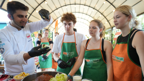 Gençler Arası Değişim Programı çerçevesinde yurt dışından Bursa'ya gelen öğrenciler, 10 gün belirlenen ailelerin yanında Türk kültürünü, örfünü ve yemek lezzetlerini tatmanın fırsatını buldu. İstanbul, Eskişehir, Çanakkale ve Bursa programları çerçevesinde ziyaretler yapan öğrenciler, Hastavuk sponsorluğunda 'Türk Yemekleri Workshop'una katıldı. Örnek yemek olarak çiğköfte yapımı için kolları sıvayan öğrenciler, renkli görüntüler ortaya koydu. Önlüğü giyen öğrenciler, bulgur ile karıştırdıkları salça, soğan, baharat ve yeşilliklerle çiğköftenin serüvenine dahil oldu. Kıvam tutturmak için boncuk boncuk terleyen öğrenciler, süre sonunda ellerini havaya kaldırarak MasterChef yarışmasını aratmayan görüntülere imza attı. Türkiye'nin vazgeçilmez lezzetlerinden çiğköfteyi hazırlayan öğrenciler, karşılarına konulan tahtaya fırlattıkları çiğköfte kıvam testini de başarıyla geçti. Çiğköfteyi çok sevdiklerini belirten öğrenciler, hazırlarken de eğlenceli dakikalar yaşadı.