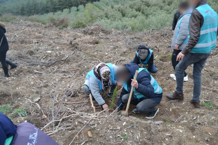 Bursa'da denetimli serbestlik yükümlüleri karaçam fidanlarını toprakla buluşturdu.