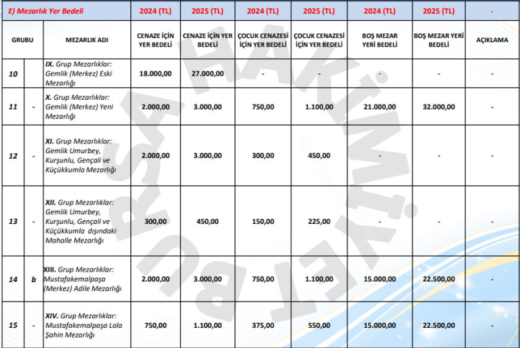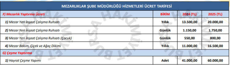 2025 yılı Mezarlıklar Şube Müdürlüğü Hizmetleri Ücret Tarifesi’ne göre; 2024 yılında 13 bin 500 TL olan mezar yeri inşaat çalışma ruhsatı (yıllık) 20 bin TL, 1.150 TL olan mezar yeri inşaat çalışma ruhsatı (günlük) bin 750 TL oldu. Günlük mezar yeri inşaat çalışma ruhsatı (çocuk) ise 550 TL’den 800 TL’ye zamlandı. Mezar Bakım, Çiçek ve Ağaç Dikimi(yıllık) ise 11 bin TL’den 16 bin 500 TL’ye yükseltildi.