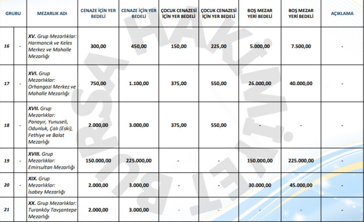 Hamitler Mezarlığı 26 bin TL‘den 40 bin TL‘ye, Ahmetpaşa-Çekirge-Pınarbaşı ve Alacahırka Mezarlığı 90 bin TL’den 135 bin TL‘ye, Hamitlerköy 18 bin TL‘den 40 bin TL‘ye, Arabayatağı, Baruthane, Değirmenlikızık, Değirmenönü, Küçükbalıklı, Piremi ve Soğanlı Mezarlığı 50 bin TL‘den 75 bin TL‘ye, Geçit, Emek, Görükle(eski), Vakıf, Beşevler, Hürriyet, İhsaniye, Fidyekızık, Hamitler(köy), Karaman, Kestel ve Tuna Mezarlığı 18 bin TL‘den 27 bin TL‘ye, Gemlik Merkez Mezarlığı 18 bin TL‘den 27 bin TL‘ye, yükseldi.