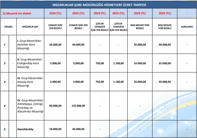 Yeni gelir tarifesine göre, Mezarlıklar Şube Müdürlüğü Hizmetleri Ücret Tarifesi de zamlandı.
