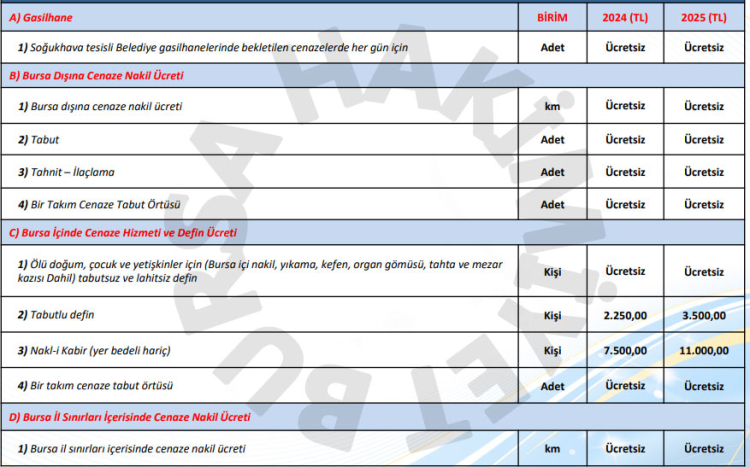 Bursa Büyükşehir Belediyesi‘nin 2025 Mali Yılı Gelir Tarifesi Kasım ayında yapılan meclis toplantısında oybirliği kabul edilmişti.