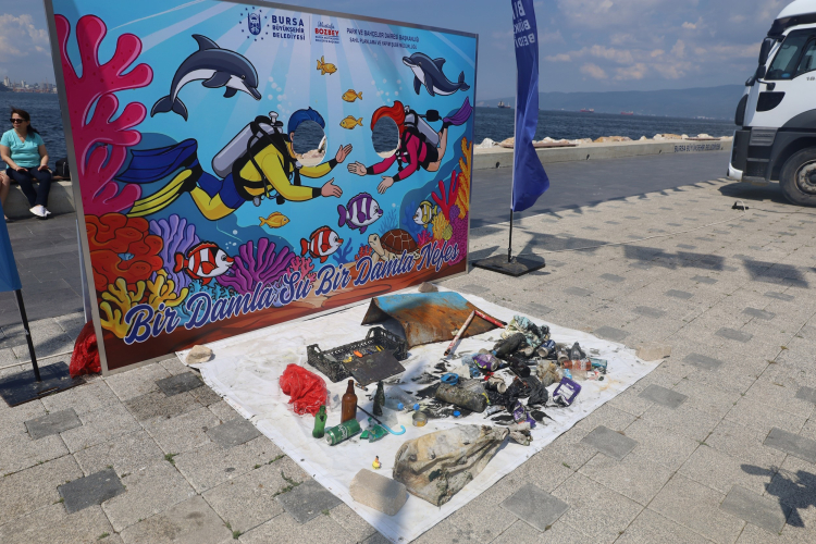 Bursa Büyükşehir Belediyesi’nin 26-29 Mayıs tarihleri arasında gerçekleştirdiği ‘Çevre Haftası Şenliği’, kentin dört bir yanındaki etkinliklerle devam ediyor. Etkinlikler kapsamında Park ve Bahçeler Dairesi Başkanlığı Sahil Planlama ve Yapım Şube Müdürlüğü tarafından Gemlik’te dalgıçlarla deniz dibi temizliği yapıldı. İskeledeki hazırlıkların ardından Espadon Dalış Merkezi’nin gönüllü dalgıçları, dalış gerçekleştirip deniz dibindeki kirliliği gözler önüne serdi. Dalgıçların, Gemlik Körfezi dibinden topladıkları plastik ve cam şişeler, metal ve ambalaj atıklar, oyuncaklar ve mutfak eşyaları, vatandaşların görmesi adına iskelede sergilendi.
