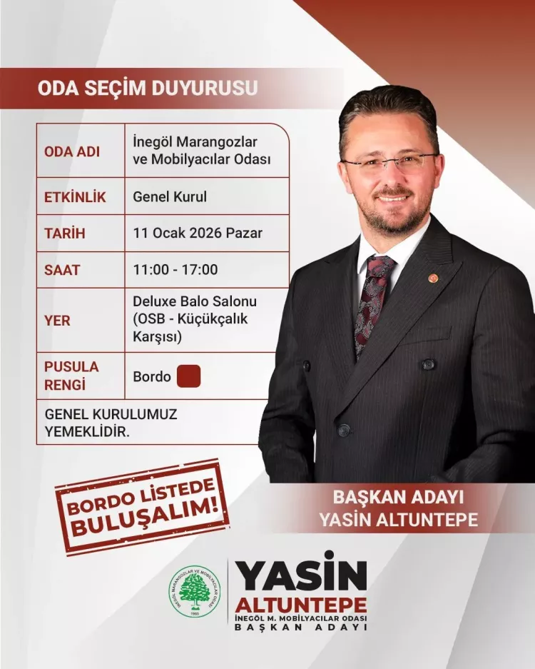 11 Ocak 2026 Pazar günü saat 11.00 ile 17.00 arasında 1.OSB Küçükçalık karşısındaki Deluxe Düğün Salonu’nda yapılacak seçimlere ilişkin açıklama yapan Yasin Altuntepe, “Uzun süredir oda seçimleri 200–300 üyenin katılımıyla yapılıyor. Ortaya çıkan katılım tablosu, İnegöl Mobilyası’nın temsil ettiği büyüklükle örtüşmüyor. Temsil gücümüz, sandığa gelen üye sayısıyla doğru orantılıdır.” dedi.