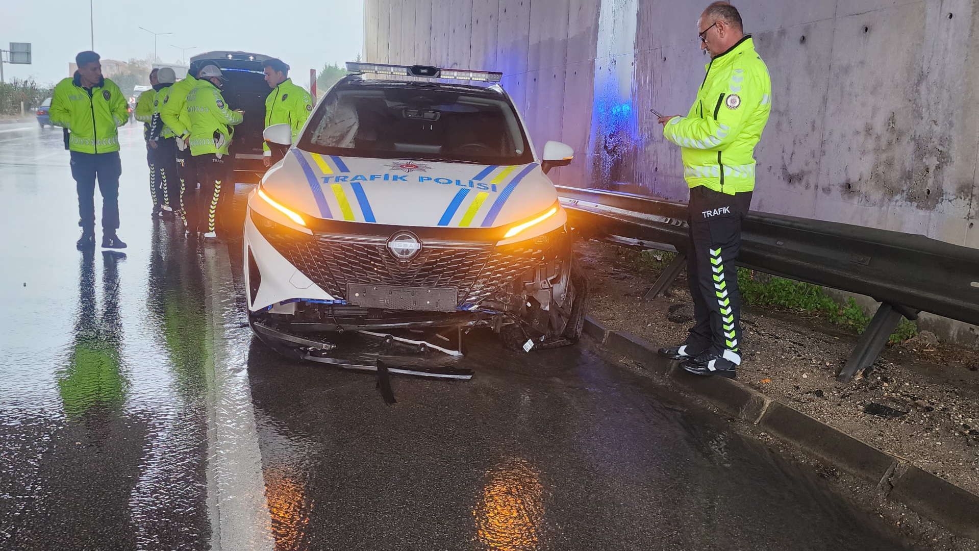 Bursa'nın Mustafakemalpaşa ilçesinde yoğun yağış nedeniyle su toplayan yolda bariyerlere çarpan otomobile olay yerinden geçen bölge trafik ekiplerinin çarpması sonucu iki kaza meydana geldi. Kaza anı kameraya yansırken, yeni alınan emniyet cipi kullanılamaz hale geldi.