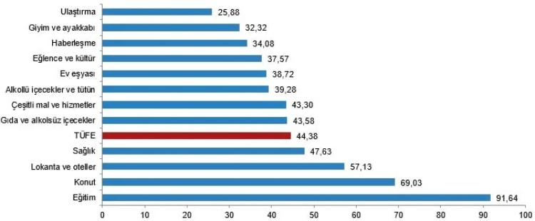 Bir önceki yılın aynı ayına göre en az artış gösteren ana grup yüzde 25,88 ile ulaştırma oldu. Buna karşılık, bir önceki yılın aynı ayına göre artışın en yüksek olduğu ana grup ise yüzde 91,64 ile eğitim oldu.