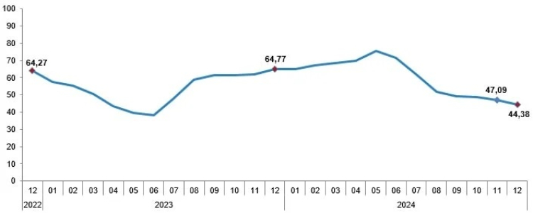 Buna göre, TÜFE'deki (2003=100) değişim 2024 yılı Aralık ayında bir önceki aya göre yüzde 1,03, bir önceki yılın Aralık ayına göre yüzde 44,38, bir önceki yılın aynı ayına göre yüzde 44,38 ve on iki aylık ortalamalara göre yüzde 58,51 olarak gerçekleşti.