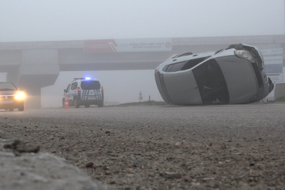 Bursa'da yoğun sis sebebiyle görüş mesafesi kaybolan sürücü, refüjdeki beton bariyere çarptıktan sonra takla attı. Sürücü, yaralı olarak hastaneye kaldırıldı.