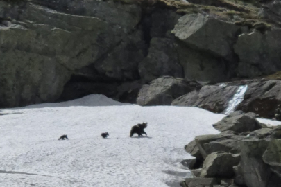 Mevsimlerin kayması sebebiyle havaların geç ısındığı hatta karın hala erimediği zirvede kış uykusunu tamamlayıp kaldıkları mağaradan çıkan anne ayı ve 2 yavrusu yiyecek ararken görüntülendi. Ayı ailesi bir süre sonra gözden kayboldu.