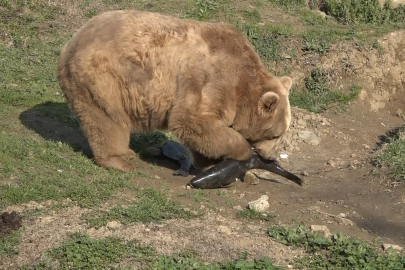 Bursa Hayvanat Bahçesinde bulunan boz ayılar, havaların mevsim normallerinin üzerinde seyretmesi sebebiyle kış uykusunu unuttu. 9 kiloluk levreği gören ayılar, paylaşmak istemese de taşıyamadığı için birini bırakmak zorunda kaldı.