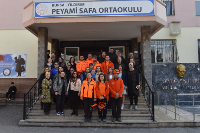 Yıldırım Belediyesi Afet İşleri Müdürlüğü ekipleri, peyami safa ortaokulu öğrenci ve öğretmenlerine deprem farkındalık eğitimi ve tatbikatı düzenledi.