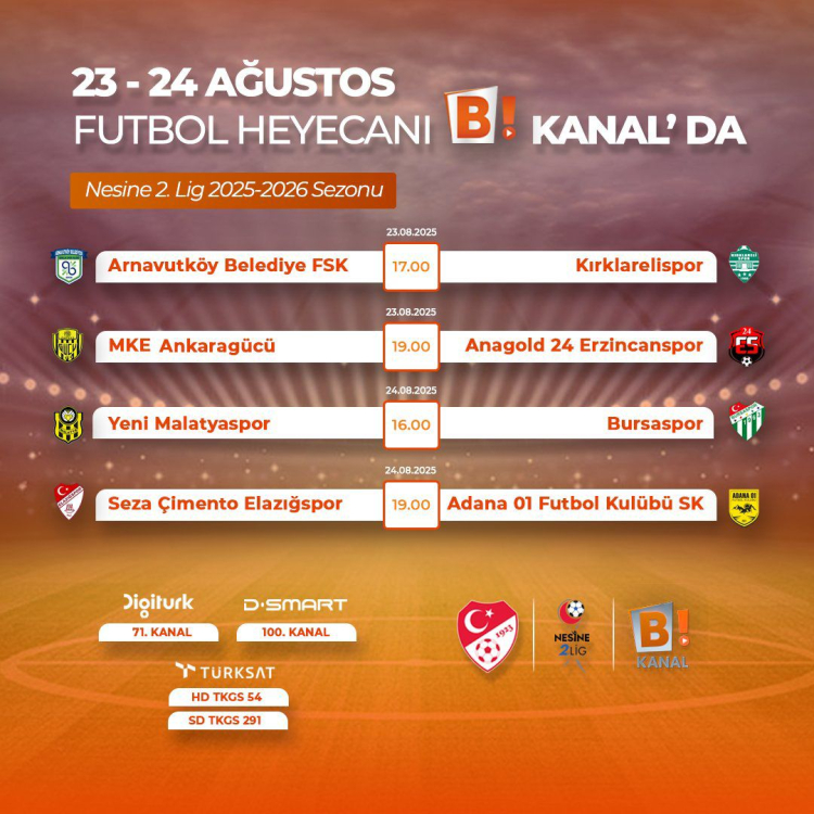TFF Nesine 2. Lig ve 3. Lig maçlarını önümüzdeki 2 sezon boyunca yayın haklarını alan Bi Kanal, bu haftaki 2.Lig canlı yayın programını açıkladı.