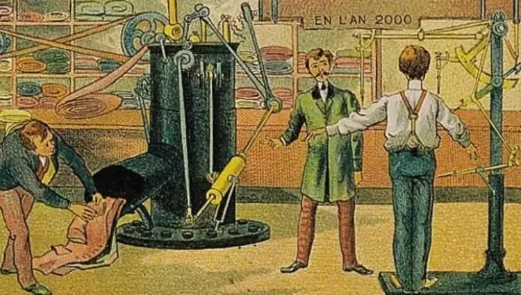 Başka bir kartpostal, bir vücudu tarayan ve talep üzerine otomatik olarak kıyafet basan bir makineyi gösteriyor . Bu, 3 boyutlu tarama sistemlerinin gelişmesiyle birlikte yavaş yavaş gerçeğe dönüşüyor.
