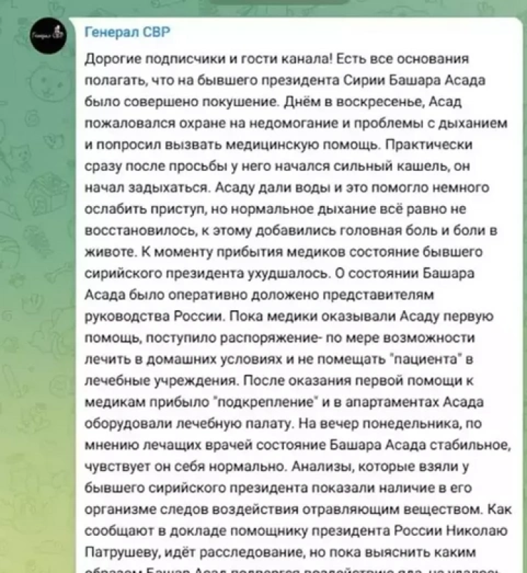 Rusya kökenli Telegram hesabı General SVR bugün çok konuşulacak bir iddia ortaya attı. Devrik liderin Pazar günü öğleden sonra kendini iyi hissetmediğini ve nefes almakta zorlandığını öne süren SVR, Esad'ın tıbbi yardım istediğini ve bunun bir 'suikast girişimi' olabileceğini yazdı.