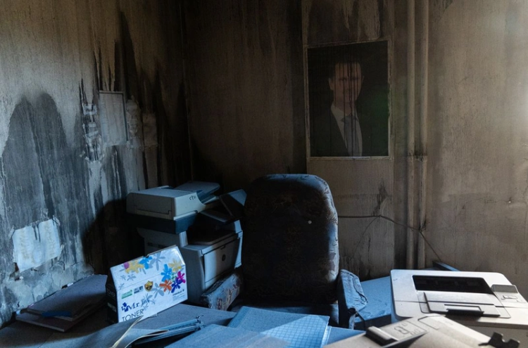 Binanın dış duvarlarında yangının izleri dururken Türk basın ekibi, idari bölümlerde istiflenerek yakılmış bazı evrak ve dosyaları görüntüledi.
