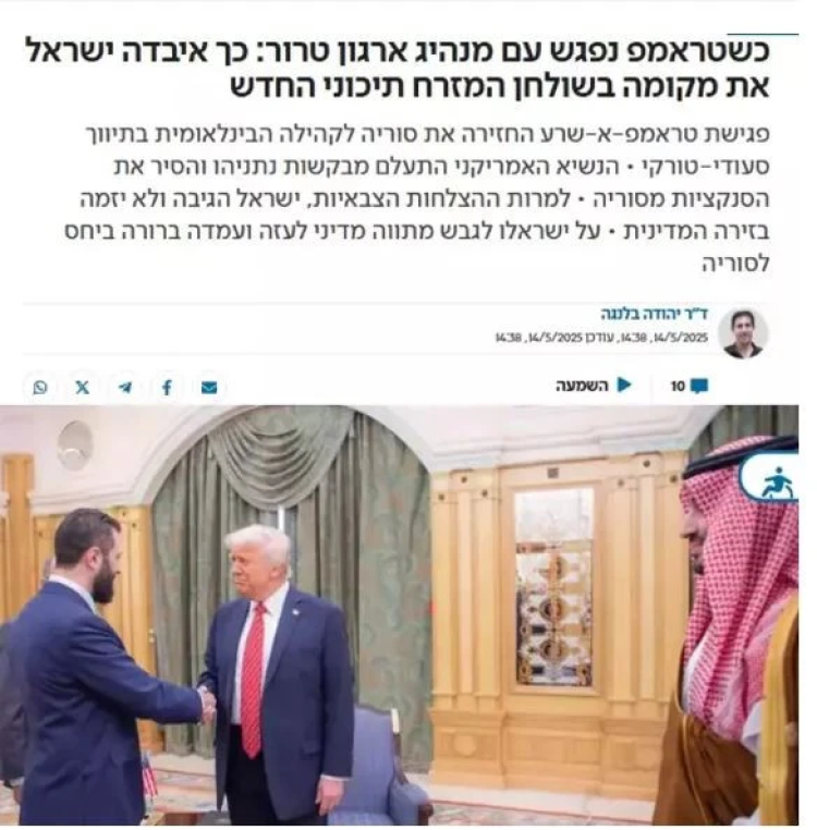 Geçtiğimiz gün Cumhurbaşkanı Recep Tayyip Erdoğan, ABD Başkanı Donald Trump, Suudi Veliaht Prensi Muhammed bin Selman ve Suriye Cumhurbaşkanı Ahmed Şara çevrim içi toplantıda bir araya geldi. Trump, toplantının ardından yaptığı açıklama ile Suriye'ye yaptırımları kaldırdığını duyurdu. Orta Doğu için baş döndüren diplomasi trafiği İsrail medyasının bir numaralı gündem maddesi oldu.