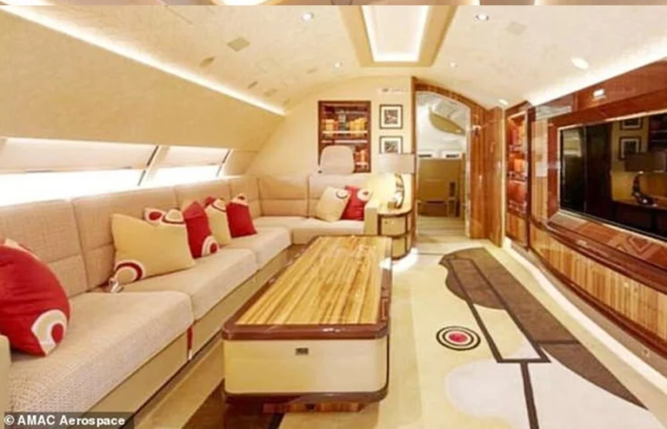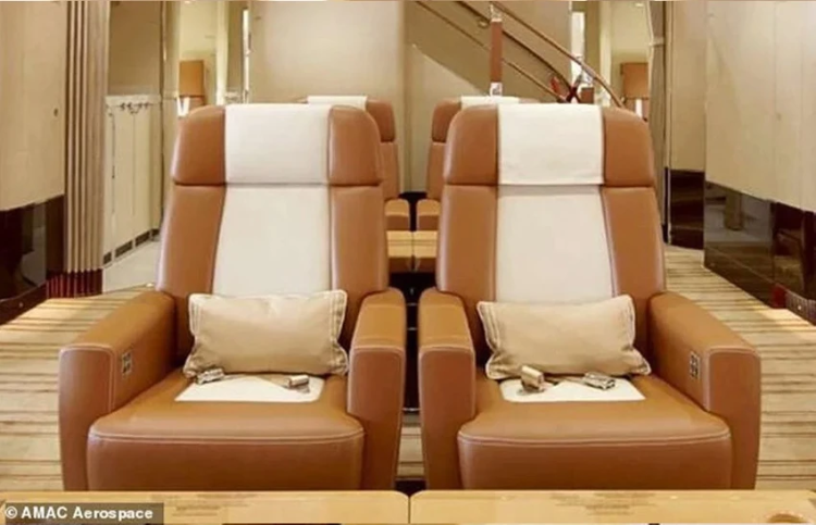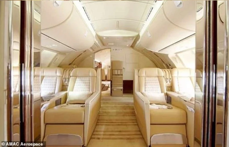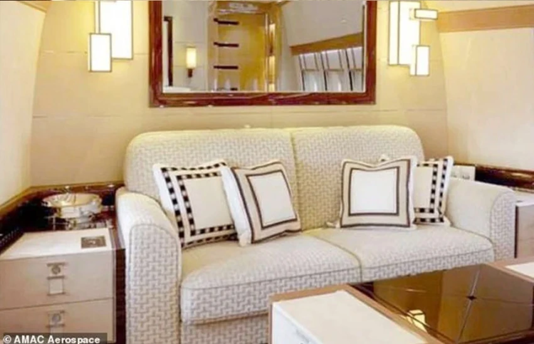 Uçaktaki hemen hemen her odada lüks halılar, deri koltuklar ve altın rengi mobilyalar bulunuyor.